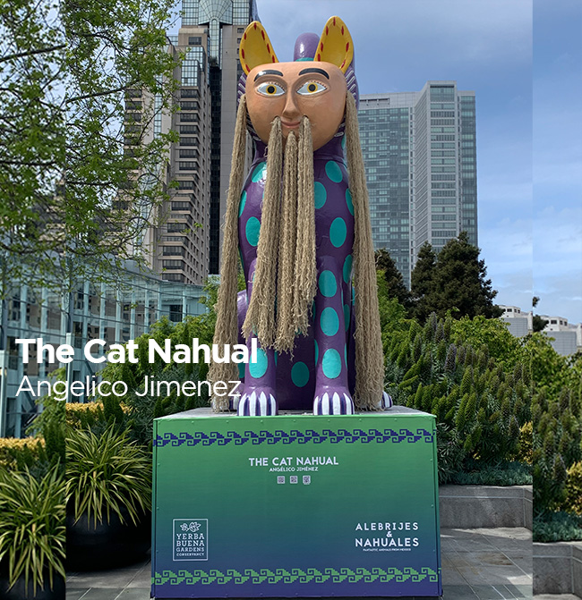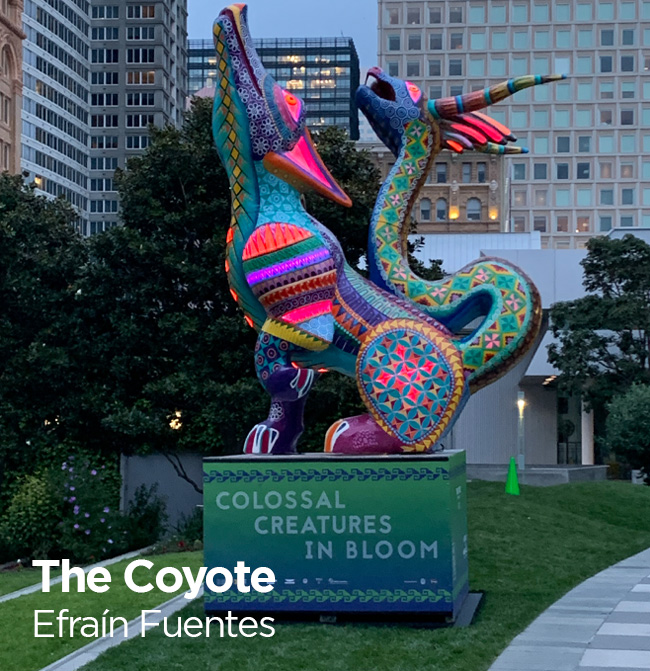 Philip Van Cauteren, the director of the Ghent Museum once said: “Contemporary artists have to fight for space in an increasingly noisy environment, where they compete with omnipresent media and advertising images, and the impact of vast cities and skyscrapers.” To get a hearing in a society overwhelmed by information and visual stimuli, artists seek to produce images that create a strong impression. The huge scale takes the fanciful alebrijes to an even more magical level. The ultimate goal of those spectacular pieces is to give the public pause for thought and to experience an installation that creates a strong and immediate effect, bringing energy and life to communities and individuals who have felt their lives constrained by the virus. The bright colored animal figures speak to people of all ages. The 20 feet high sculptures are reproductions of original carved wooden works by recognized local artists from various communities.